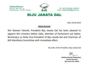 ଭୁବନେଶ୍ବର,୩/୦୪: ବିଜେଡ଼ି ପକ୍ଷରୁ ବ୍ରହ୍ମପୁର ଲୋକସଭା ସାଂସଦ ଚନ୍ଦ୍ରଶେଖର ସାହୁଙ୍କୁ ନୂଆ ଦାୟିତ୍ବ ପ୍ରଦାନ କରାଯାଇଛି। ତାଙ୍କୁ ବିଜେଡ଼ି ରାଜ୍ୟ ଉପସଭାପତି ଦାୟିତ୍ବ ସହିତ ବିଜେଡି ଇସ୍ତାହାର କମିଟିର ଅଧ୍ୟକ୍ଷ କରାଯାଇଛି। ଏହାକୁ ଶୀଘ୍ର କାର୍ଯ୍ୟକାରୀ କରିବାକୁ ମୁଖ୍ୟମନ୍ତ୍ରୀ ନବୀନ ପଟ୍ଟନାୟକ ତଥା ବିଜେଡ଼ି ରାଜ୍ୟ ସଭାପତିଙ୍କ ଦ୍ବାରା ଜାରି ହୋଇଥିବା ବିଜ୍ଞପ୍ତି ପତ୍ରରେ ଉଲ୍ଲେଖ କରାଯାଇଛି।