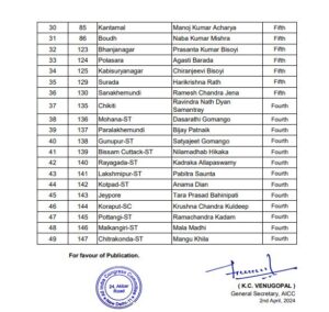 ଭୁବନେଶ୍ୱର, ୨/୦୪: ନିର୍ବାଚନ ତାରିଖ ଘୋଷଣା ପରେ ସବୁ ରାଜନୈତିକ ଦଳରେ ପ୍ରସ୍ତୁତି ଆରମ୍ଭ ହୋଇଛି। ଏହାରିମଧ୍ୟରେ ୨୦୨୪ ନିର୍ବାଚନ ପାଇଁ ପ୍ରାର୍ଥୀ ତାଲିକା ଘୋଷଣା କଲା କଂଗ୍ରେସ । ୮ ଲୋକସଭା ଓ ୪୯ ବିଧାନସଭା ଆସନ ପାଇଁ ପ୍ରାର୍ଥୀ ଘୋଷଣା କରିଛି କଂଗ୍ରେସ । ପିସିସି ସଭାପତି ଶରତ ପଟ୍ଟନାୟକ ନୂଆପଡା ଆସନରୁ ପ୍ରାର୍ଥୀ ହୋଇଥିବା ବେଳେ ବଲାଙ୍ଗୀର ବିଧାନସଭା ଆସନରୁ ପ୍ରାର୍ଥୀ ହୋଇଛନ୍ତି ନରସିଂହ ମିଶ୍ରଙ୍କ ପୁଅ ସମରେନ୍ଦ୍ର ମିଶ୍ର । ସେହିଭଳି ପୂର୍ବତନ କେନ୍ଦ୍ରମନ୍ତ୍ରୀ ଭକ୍ତ ଦାସ ନର୍ଲାରୁ ପ୍ରାର୍ଥୀ ହୋଇଥିବା ବେଳେ ଭବାନୀପାଟଣାରୁ ପ୍ରାର୍ଥୀ ହୋଇଛନ୍ତି ସାଗର ଚରଣ ଦାସ । ସେହିଭଳି ସାନଖେମୁଣ୍ଡିରୁ ରମେଶ ଜେନା ପୁଣିଥରେ କଂଗ୍ରେସ ପ୍ରାର୍ଥୀ ହୋଇଥିବା ବେଳେ ବିଜୟ ପଟ୍ଟନାୟକଙ୍କୁ ପାରଳାଖେମୁଣ୍ଡିରୁ ପ୍ରାର୍ଥୀ କରିଛି କଂଗ୍ରେସ । ତାରା ବାହିନୀପତିଙ୍କୁ ଜୟପୁର ଆସନରୁ ଦଳ ପ୍ରାର୍ଥୀ କରିଥିବା ବେଳେ ହକି ତାରକା ପ୍ରବୋଧ ତୀର୍କିଙ୍କୁ ତଳସରାରୁ ଦଳ ମୈଦାନକୁ ଓହ୍ଲାଇଛି ।