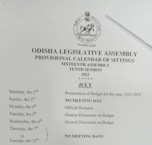 ଭୁବନେଶ୍ୱର,୧୦/୬: ଜୁଲାଇ ୨ରୁ ବିଧାନସଭା ମୌସୁମୀ ଅଧିବେଶନ। ଅଗଷ୍ଟ ୪ ଯାଏ ମୌସୁମୀ ଅଧିବେଶନ ଚାଲିବାକୁ ଥିବା ବେଳେ ମୋଟ ୨୪ କାର୍ଯ୍ୟଦିବସ ରହିଛି । ସେହିଭଳି ଜୁଲାଇ ୨ରେ ଉପସ୍ଥାପନ ହେବ ପୂର୍ଣ୍ଣାଙ୍ଗ ବଜେଟ । ଅଧିବେଶନର ପ୍ରଥମ ଦିନରେ ହିଁ ବଜେଟ ଉପସ୍ଥାପନ ହେବ ବୋଲି ସୂଚନା ମିଳିଛି ।